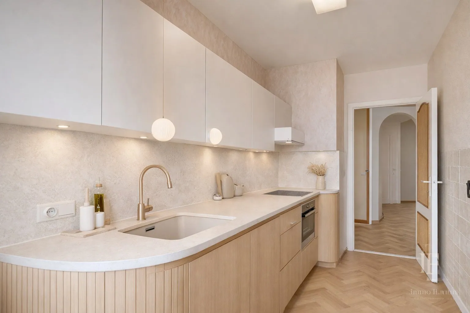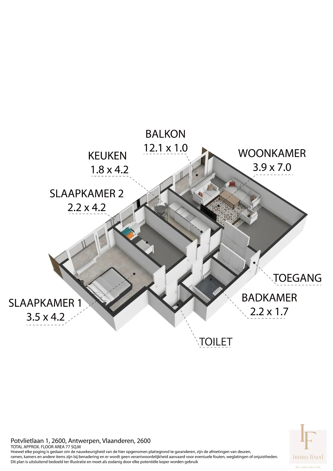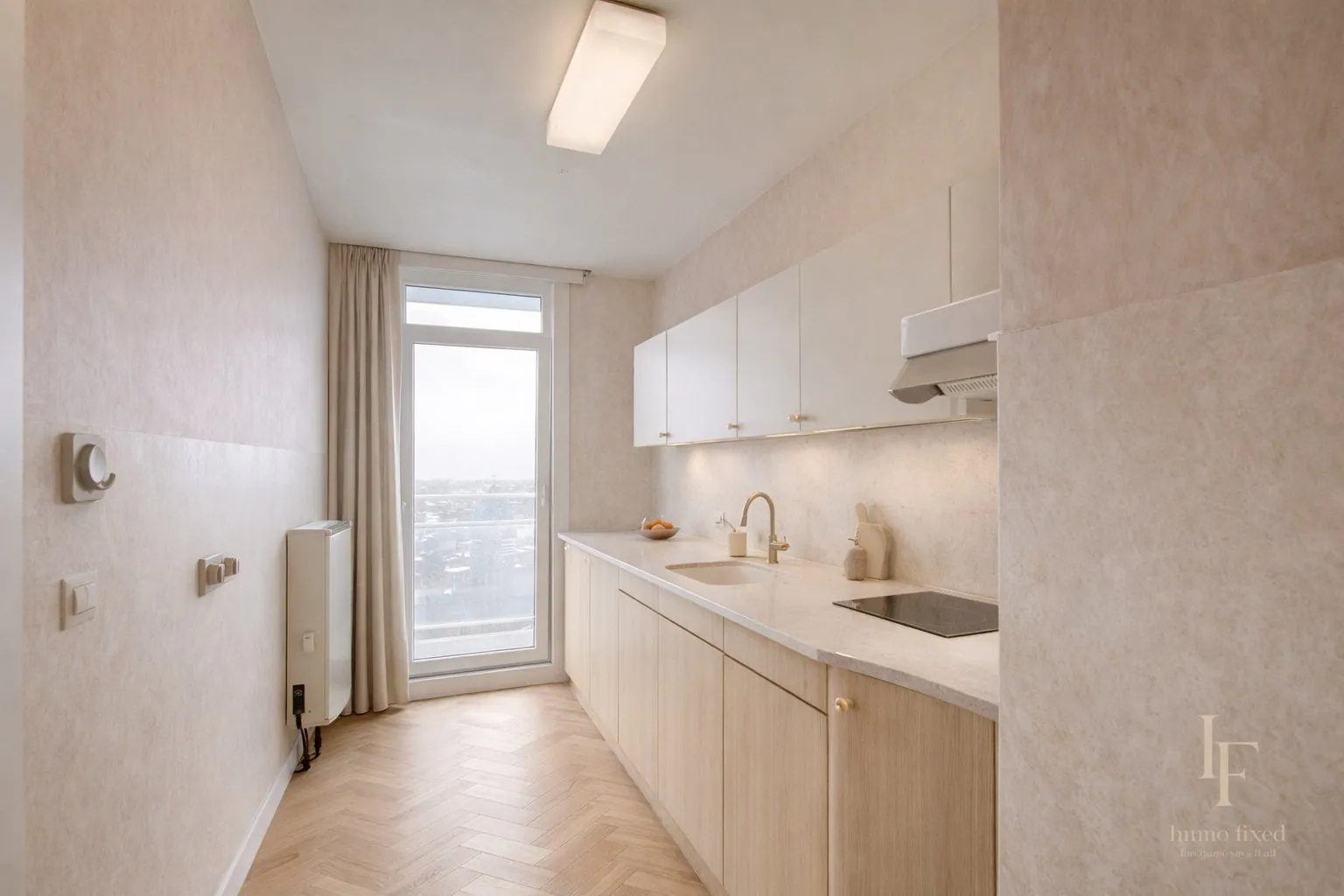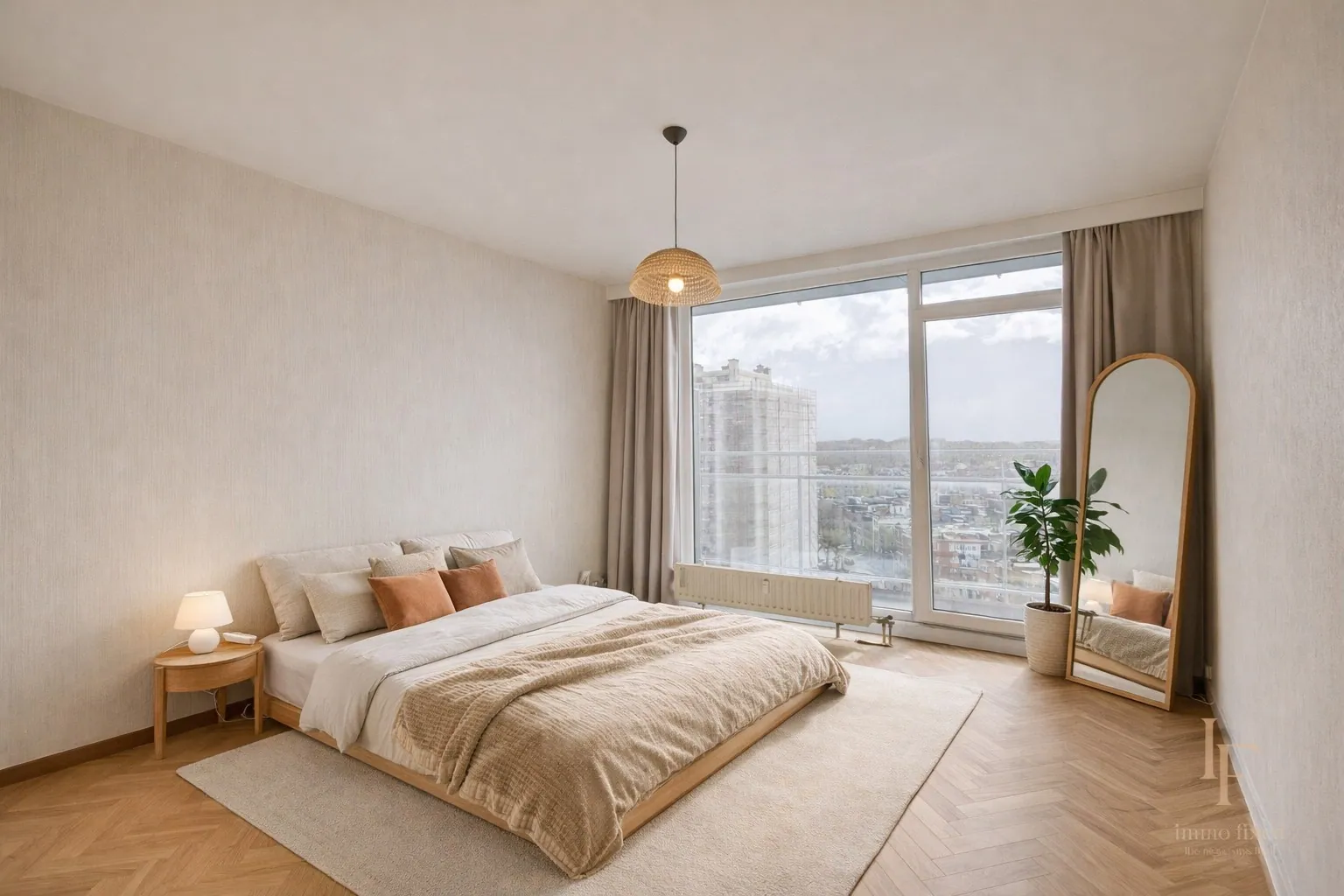 De getoonde beelden zijn renders en dienen louter ter illustratie. Ze geven een realistisch beeld van hoe het appartement kan worden omgevormd tot een hedendaagse, warme en stijlvolle woonst.