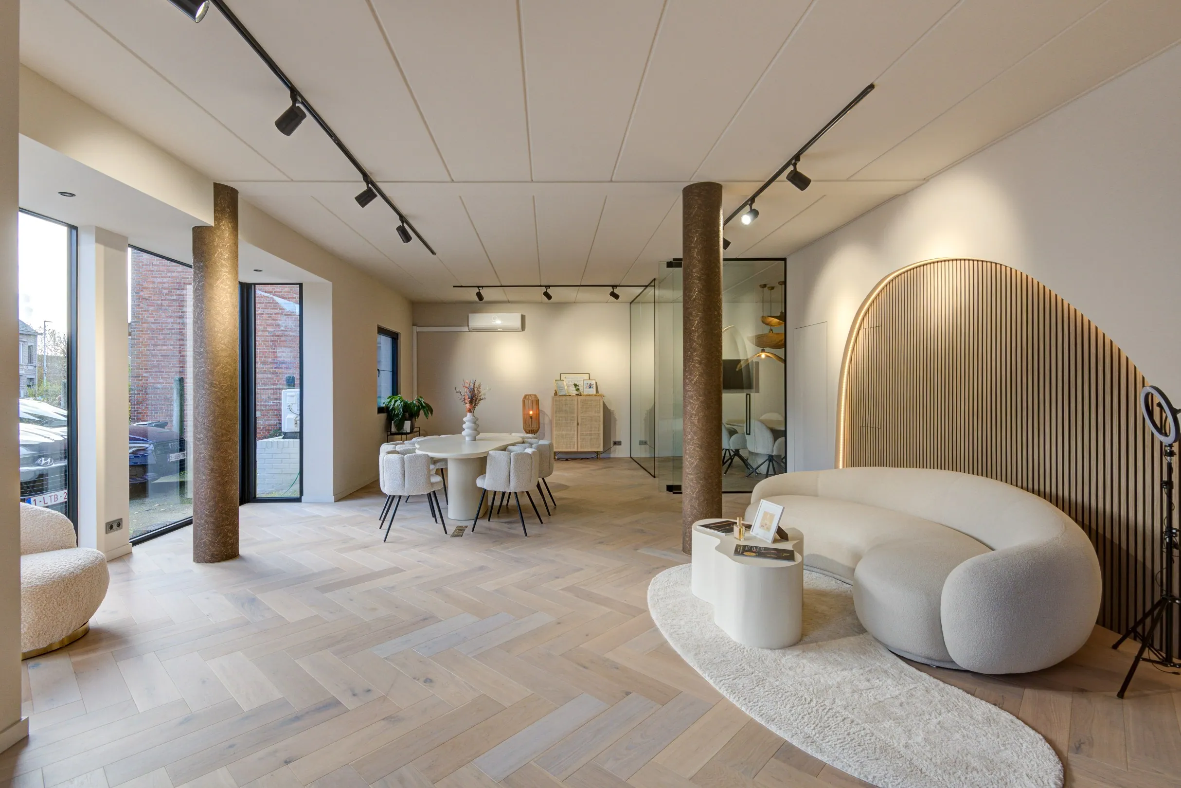 Bij binnenkomst word je verwelkomd door een open, lichte ruimte met royale raampartijen die overvloedig daglicht binnenlaten. Het visgraatparket straalt tijdloze klasse en warmte uit, terwijl zachte beige tinten en ronde vormen rust en elegantie toevoegen. De ruimte wordt extra verlicht door plafondspots die gericht kunnen worden op accenten naar wens. Ook de etalage beschikt over aparte verlichting, terwijl strategisch geplaatste hanglampen en ingebouwde ledverlichting in keuken, accentmuur en toilet een verfijnde touch geven.