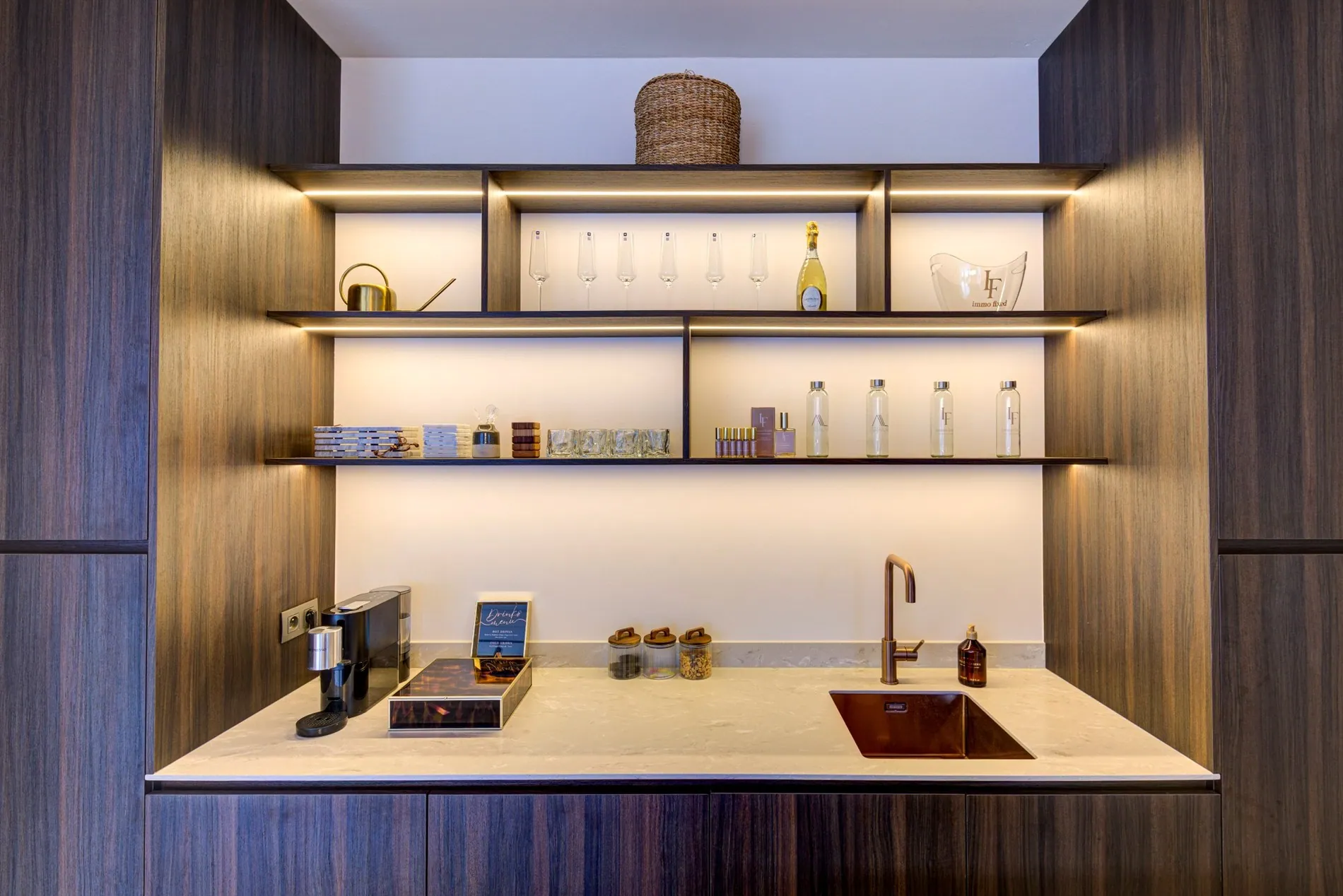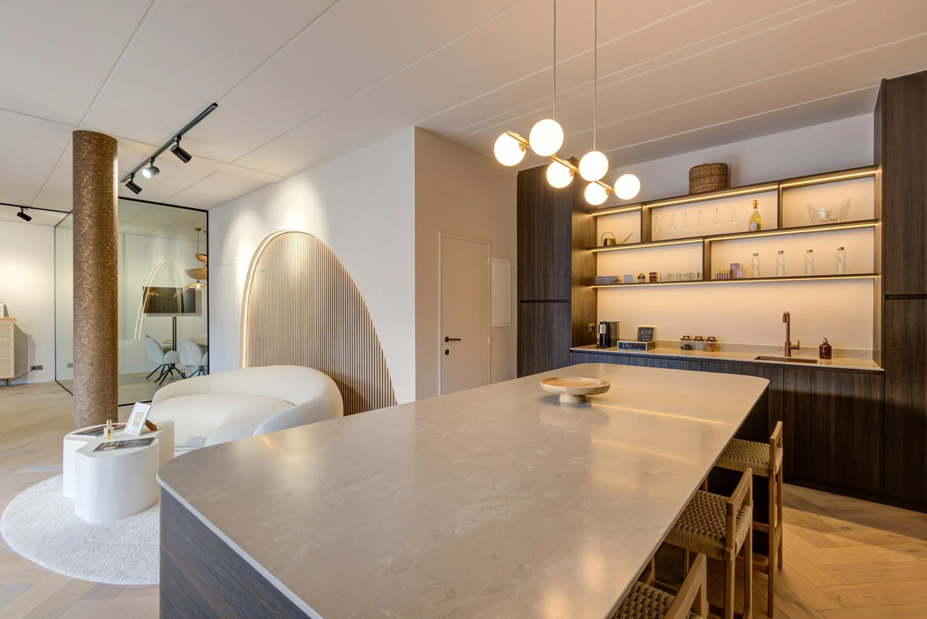 De loungehoek, met organische lijnen en tactiele materialen, is een heerlijke plek voor informele gesprekken, creatieve pauzes of een moment van ontspanning. Houten wandaccenten met ingebouwde ledverlichting creëren een professionele, maar toch gezellige sfeer waarin klanten zich onmiddellijk thuis voelen.