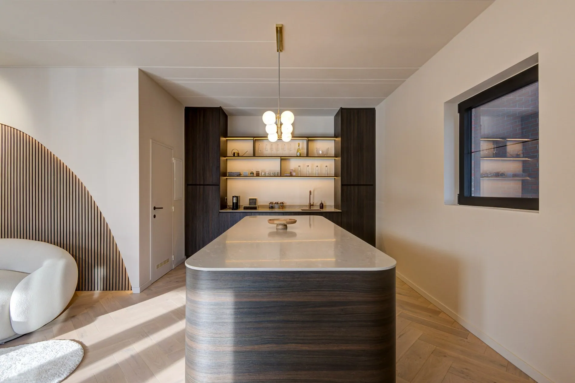 Bij binnenkomst word je verwelkomd door een open, lichte ruimte met royale raampartijen die overvloedig daglicht binnenlaten. Het visgraatparket straalt tijdloze klasse en warmte uit, terwijl zachte beige tinten en ronde vormen rust en elegantie toevoegen. De ruimte wordt extra verlicht door plafondspots die gericht kunnen worden op accenten naar wens. Ook de etalage beschikt over aparte verlichting, terwijl strategisch geplaatste hanglampen en ingebouwde ledverlichting in keuken, accentmuur en toilet een verfijnde touch geven.