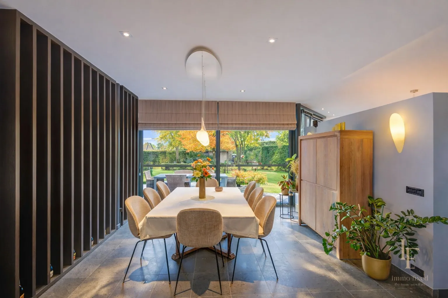 De eetkamer sluit naadloos aan op zowel leefruimte als tuin. Een praktische en sfeervolle plek voor dagelijkse maaltijden en langere diners.