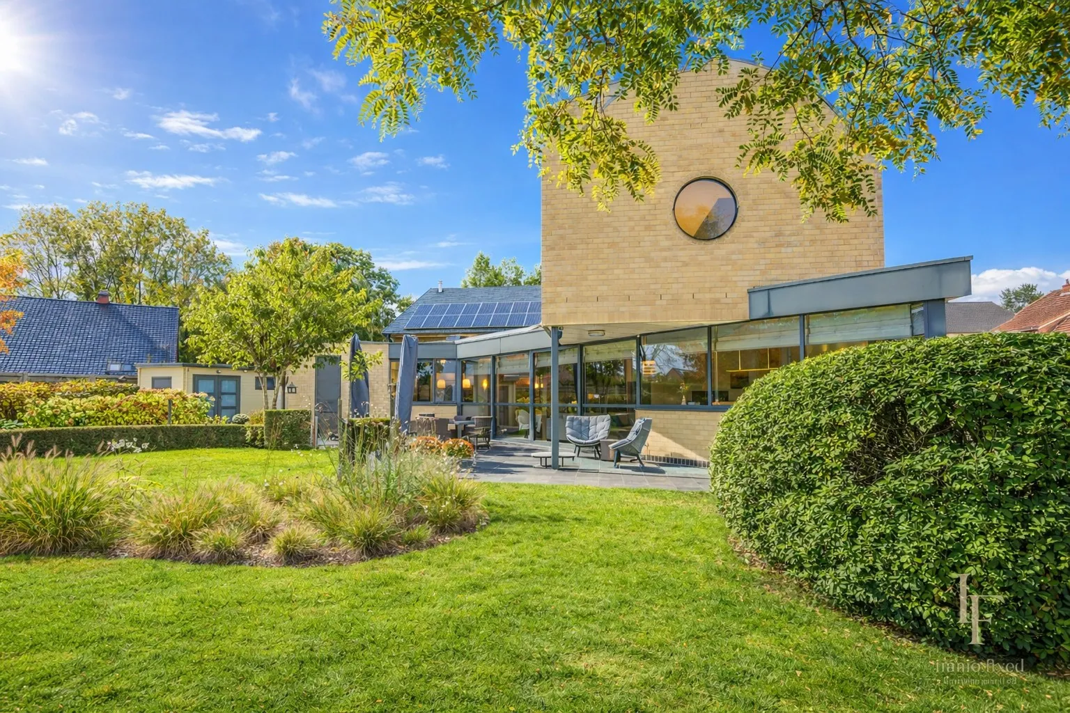 De leefruimte geniet van een overvloed aan natuurlijk licht dankzij grote raampartijen met zicht op de tuin. Dit creëert een aangename en open woonbeleving.