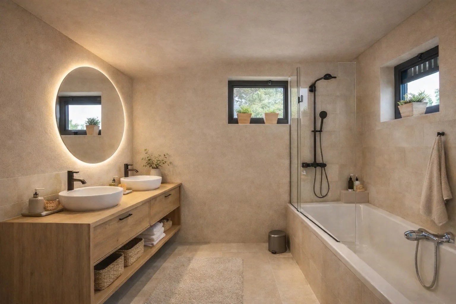De combinatie van natuursteen, zachte kleuren en verfijnde afwerking zorgt voor rust en harmonie. De connectie met de eetruimte en de doordachte verlichting versterken het geheel.