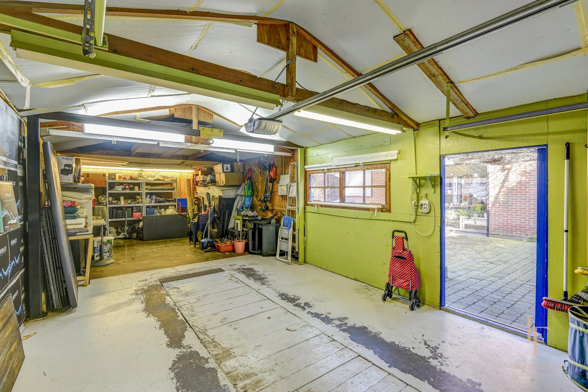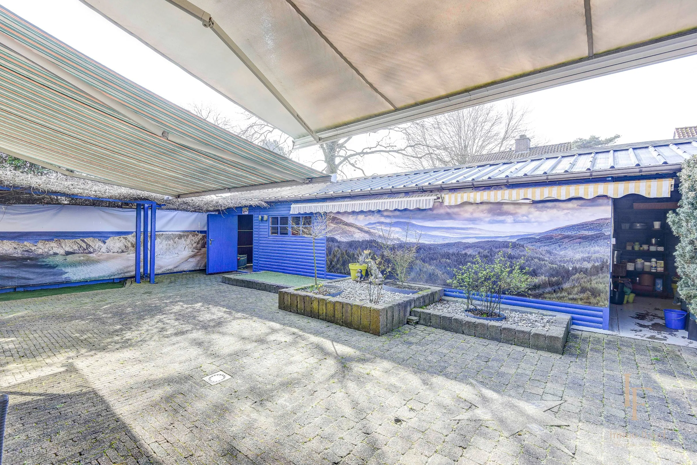 Aansluitend aan de woning bevindt zich een bijzonder ruim terras van ongeveer 80 m², waar u in alle rust kan genieten. Het terras kan gedeeltelijk overkapt worden met luifels, waarvan twee elektrisch bedienbaar zijn. Achteraan het perceel staat bovendien een extra garage of werkruimte van 40 m². Via de zijkant van de woning bereikt u eenvoudig de oprit. De woning is daarnaast volledig uitgerust met elektrische rolluiken.